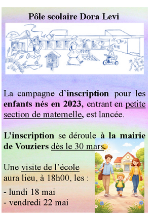 À partir du 30 mars 2026, les inscriptions pour les enfants nés entre le 1er janvier et le 31 décembre 2023 — qui intégreront la petite section maternelle en septembre 2026 — se dérouleront en Mairie de Vouziers.